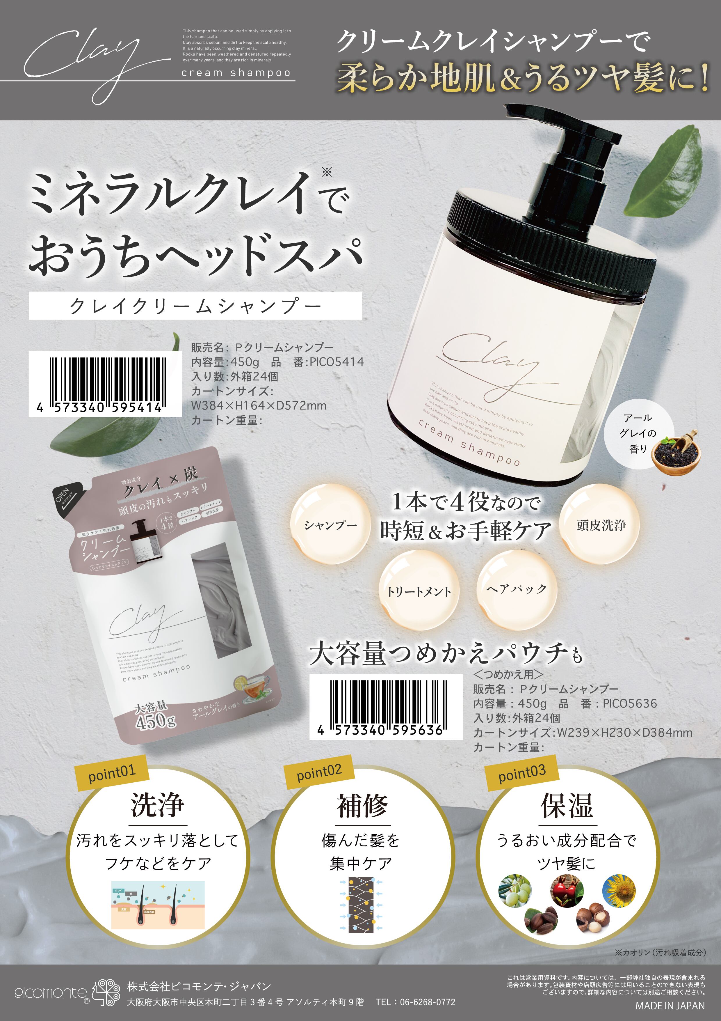 日本製クレイクリームシャンプー詰め替え450ml ピコモンテ