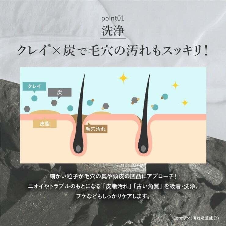 クレイ成分が含まれており、頭皮の汚れや余分な皮脂を吸着して取り除き、洗浄力を高めます。
